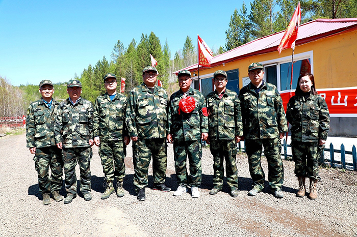 阿木爾林業局、依東林場領導干部與即將退休的共產黨員、管護員滿德江合影。(王力 攝)