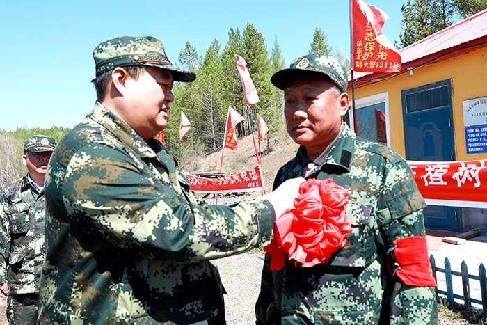 正當滿德江依依不舍之際,林業局黨委書記胡守慶等領導來到管護站,為其佩戴“光榮花”和黨徽,并贈送了禮物,向一名老黨員表達了最高的敬意。