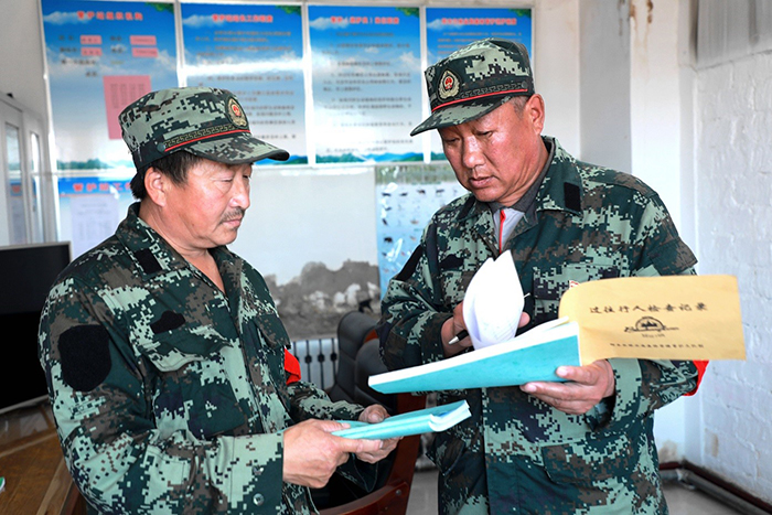 共產黨員、管護員滿德江叮囑“戰友”張振東把記錄本記好。(王力 攝)