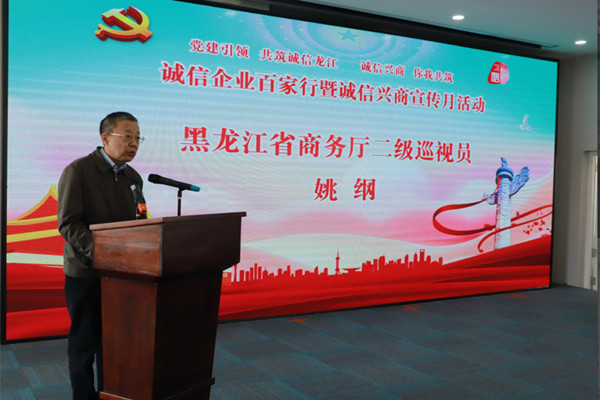 省商務廳二級巡視員姚綱在致辭中指出,此次黑龍江省“誠信企業(yè)百家行”暨“誠信興商宣傳月”活動,是加強誠信宣傳,提升全社會誠實守信意識,優(yōu)化消費和營商環(huán)境的一次重要舉措。省商務廳將會同相關(guān)單位統(tǒng)籌協(xié)調(diào)、密切配合,做到政府帶頭講誠信,商貿(mào)流通企業(yè)為“誠信興商”活動主體,通過宣傳商務誠信文化和信用管理知識,引導市場主體樹立誠信興商經(jīng)營理念,提高信用管理能力,營造崇信守法的營商環(huán)境。培育消費者信用消費習慣,提升風險防范意識,依法維護自身合法權(quán)益,引導和帶動整個商貿(mào)行業(yè)的誠信建設(shè)。