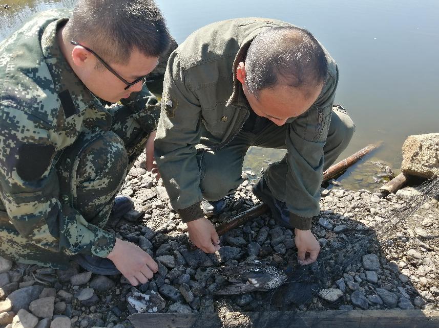 圖強林業局森林資源管理科工作人員在壯林林場施業區檢查工作時,發現一只綠翅鴨被粘網粘住,資源科工作人員對其展開營救。