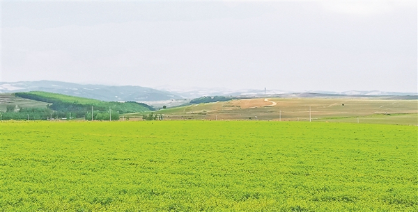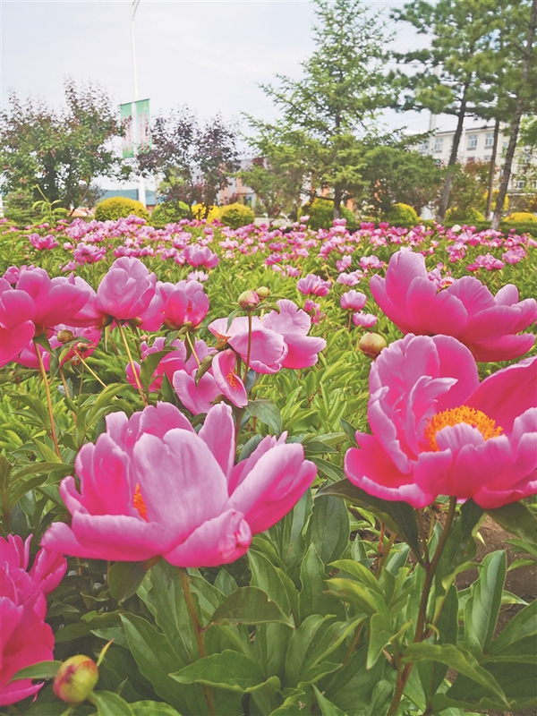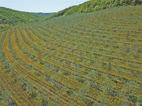 沿著公路,中藥材種植基地呈現一片花海:大片芍藥已經開花,白的粉的隨風飄搖;千畝黃芩都已經3歲,仿佛綠蘿緞一直蔓延到遠方的山坡;萬畝沙棘谷,更像一幅水墨畫,剛露頭的沙棘果盡顯萌態;樹下間作的蒲公英盛開著黃色的小花;紫的泛黑的藍靛果吸引一群群鳥兒不停來啄食……