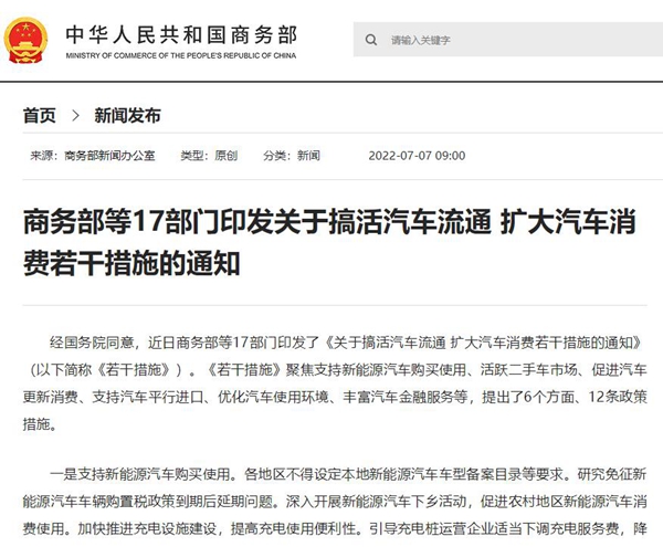 日前,商務部等17部門印發了《關于搞活汽車流通 擴大汽車消費若干措施的通知》,《措施》聚焦支持新能源汽車購買使用、活躍二手車市場、促進汽車更新消費、支持汽車平行進口、優化汽車使用環境、豐富汽車金融服務等,提出了6個方面、12條政策措施。