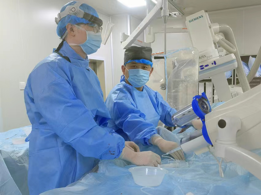 “患者入院后雖進行了快速靜脈溶栓,但病情依然進展性加重,我們發現患者病情為顱內主干血管閉塞導致,情況十分危急,如果不及時介入開通閉塞的顱內大血管,一旦錯過治療最佳時機,患者就可能會出現危及性命等情況。”毛鐵副主任醫師回憶了當時搶救情景。搶救刻不容緩,在爭得家屬同意并簽字后,神經介入團隊立即將張先生送至導管室進行介入取栓治療。