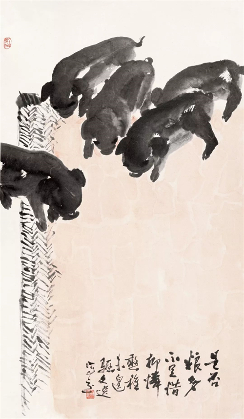 湯文選的人物、山水、花鳥、墨虎等一系列作品,融會著、貫穿著“三種傳統(tǒng)”。或隱或顯,或化解之,或凝聚之,或熔裁之,或獨造之。“三種傳統(tǒng)”,可概括為現(xiàn)實主義在中國畫發(fā)展歷程中的三段式,亦曰交叉出現(xiàn)的不同歷史內(nèi)涵、文化反映的三種藝術(shù)狀態(tài):首先,是古代現(xiàn)實主義傳統(tǒng)——“外師造化,中得心源”。其二,是“五四”現(xiàn)實主義傳統(tǒng)——融合西法,崇尚寫實。其三,是新中國成立后倡導(dǎo)的革命現(xiàn)實主義傳統(tǒng)。深入火熱斗爭,深入工農(nóng)兵。學(xué)習(xí)延安木刻,學(xué)習(xí)民間年畫,學(xué)習(xí)蘇聯(lián)油畫現(xiàn)實主義的創(chuàng)作方法(50年代)。其后,“一手伸向生活,一手伸向傳統(tǒng)”(60年代)。在以上“三種傳統(tǒng)”的交匯點上,伸延出湯文選早期和中期的現(xiàn)實主義創(chuàng)作之路。湯文選中國畫藝術(shù)的現(xiàn)實主義,其主要特征為積極的入世態(tài)度,強(qiáng)烈的人文主義色彩,個性、民族性與時代性的完美統(tǒng)一,以及嚴(yán)肅的歷史使命感。