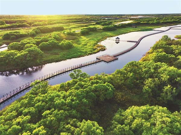 在黑瞎子島濕地公園,登上全景平臺,游客可以一覽濕地全貌,體會親水、親綠、親近自然的愜意。2256米的漂浮式木棧道九曲回廊,浮筒的設計使浮橋水漲橋漲、水降橋降。