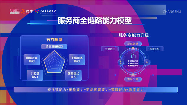 快手電商服務商則介紹了服務商全鏈路能力模型。針對商家主播能力弱、私域流量差、貨品不健全、投流ROI難提升等痛點,服務商可以發揮流量營銷、直播運營、主播孵化、供應鏈、服務履約等全鏈路能力,助力商家冷啟孵化和躍遷。自今年3月底常熟服飾產業帶落地至今,快手服務商已服務500多個常熟商家,常熟當地快手動銷商家數提升30%+。