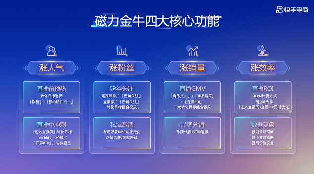 本次活動,快手磁力金牛和快手電商服務商也宣布推出一系列政策,推動常熟女裝商家電商生意增長。作為電商生意的加速器,快手磁力金牛讓商家投流更精準、效率更高、效果更好。在賬號啟動期,商家可借助磁力金牛進行私域起量,并根據貨盤制定營銷策略;在賬號成長期,商家可依據S-A-B直播策略模型,使用磁力金牛進行差異化投流、精細化運營;在賬號成熟期,磁力金牛可以在品效協同下進行差異化拓客,引入新流量。