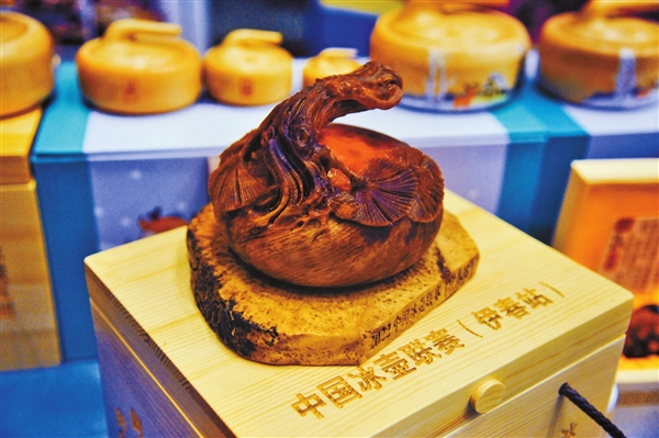 此次,美江木藝有限責任公司共展出了100余件產品,其中,最引人注目的瑞虎冰壺,由美江木藝公司為2022中國冰壺聯賽(伊春站)主題創作,最大直徑1.8米,總高度1.6米。主體壺身采用2022個小興安嶺山核桃做原料,壺蓋部分采用小興安嶺珍貴樹種紅松。作品構思巧妙、用材獨特,既契合本次冰壺聯賽內容,又充分體現了林都伊春、冰壺之鄉的地域特征。構成壺身的2022個山核桃,寓意著2022年河山錦繡的小興安嶺,構成壺蓋的興安紅松,蘊含著華夏文明“鴻運當頭”的美好期許。此藝術品既體現伊春的森林文化藝術與競技體育相融合的發展理念,也展現了伊春的冰雪經濟和木藝創意設計產業的發展成果。