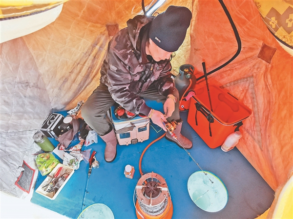 比賽現場,冰面上色彩各異的帳篷錯落排開,來自我省東部地區多個地市的70名釣魚愛好者聚集在此,感受垂釣魅力。當日室外最低溫度零下20℃,而冰釣帳篷內卻是熱氣騰騰。選手們用小火爐取暖,調料、打窩,各展技藝,不一會兒都收獲頗豐。