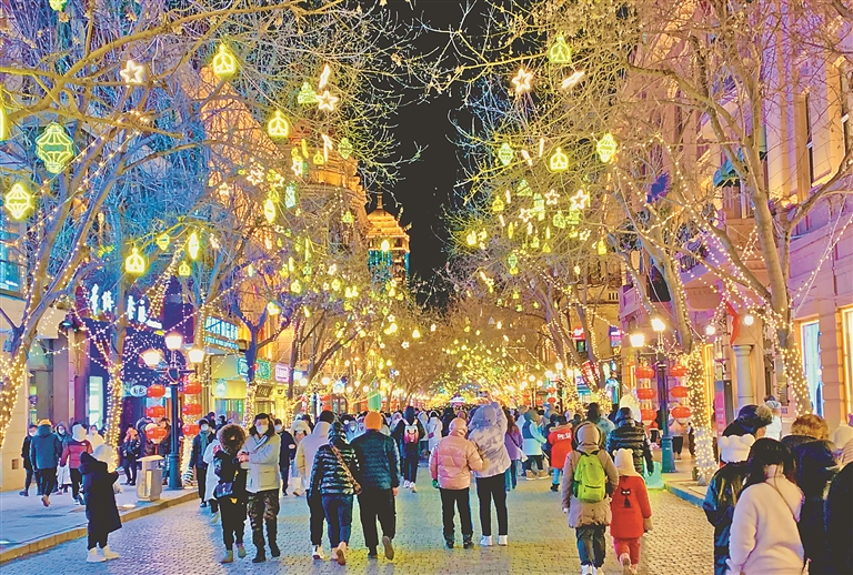 穿過歐式建筑,滿滿冰城風情的彩燈以及年味十足的大紅燈籠將哈爾濱中央大街點亮。2023年新年伊始,百年老街呈現出游人如織的火熱場面,熟悉又熱鬧的氣氛彌漫在老街的各個角落,煙火氣持續升騰。欣賞唯美的陽臺音樂秀,品嘗鍋包肉、馬迭爾冰棍等特色美食,打卡“星空燈”、“雪妮妮網紅兔子”雪雕……游客和市民沉浸在一個個融合創意與冰城特色的冰雪玩法和體驗之中,盡情享受冰雪帶來的歡樂。數據顯示,僅春節期間,中央大街日均客流量維持在40萬人次,高峰時期達到70余萬人次。