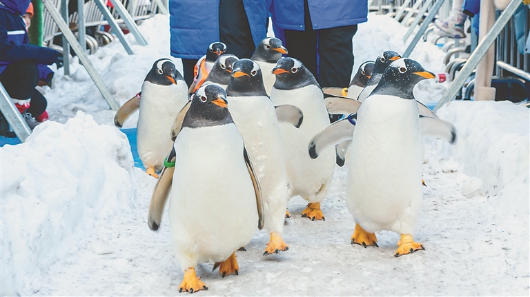 “我們就是專程為‘淘學企鵝’而來,能在哈爾濱看到全國僅有的企鵝冰雪巡游,真的不虛此行。”早在1年前,上海游客孟蕓就通過短視頻看到它們背著小書包打卡黑龍江美景的身影,成為妥妥的“鵝粉”。她說,為了能在前排近距離觀看,她更是早早就來到極地廣場等候。哈爾濱極地公園營銷部經理崔美艷說,“淘學企鵝冰雪巡游”自啟動以來,每日引萬人打卡,成為今冬的爆款網紅活動,吸引全國游客來到哈爾濱看企鵝打卡拍攝,全網曝光量更是在25天的時間里突破了8.5億。