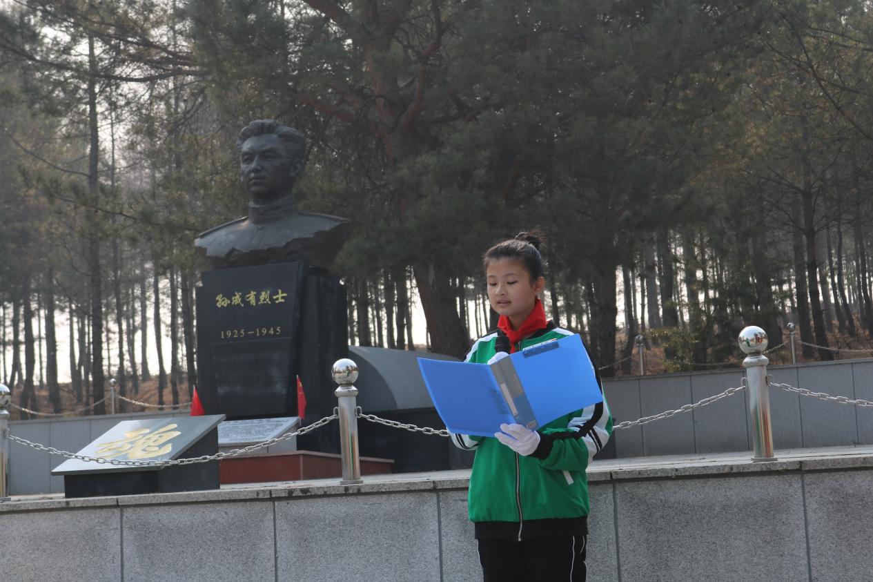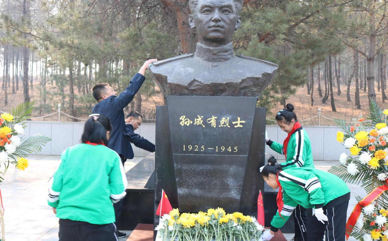上午九時整,參加祭掃人員在孫成有烈士墓前列隊。全體人員肅立、脫帽,奏唱《中華人民共和國國歌》,溫春中心校學生代表獻唱《中國少年先鋒隊隊歌》,并介紹孫成有烈士光榮事跡。隨后,全體人員向烈士垂首默哀,表達對革命先烈的哀思及敬仰。默哀畢,區人武部代表和溫春中心校少先隊員向烈士紀念碑敬獻花籃,參加祭掃儀式的全體人員依次瞻仰烈士紀念碑。