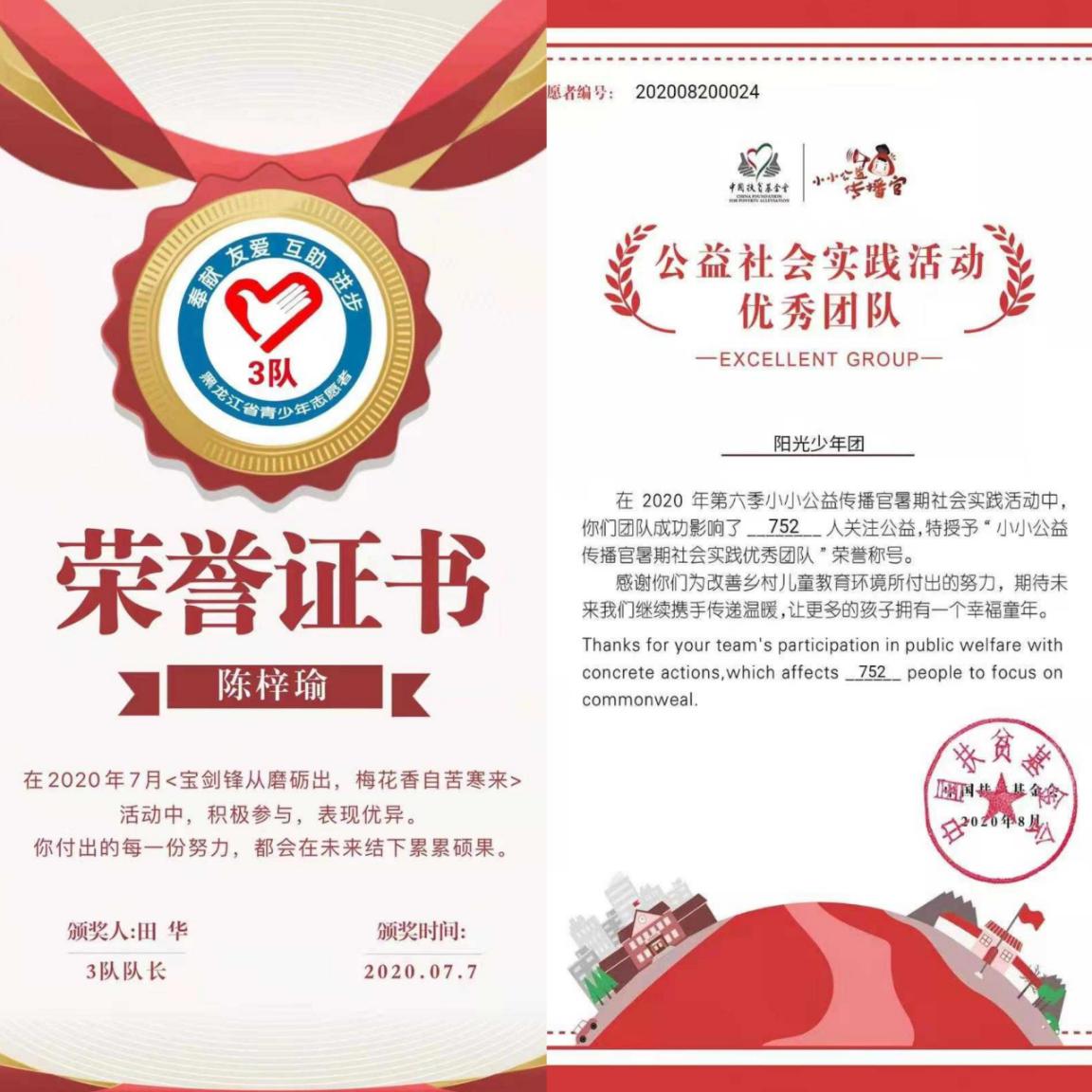 她在志愿服務中不怕苦不怕累,圓滿完成各項任務,獲得各界一致好評,先后獲得省市(區)的相關表彰,并被省幫扶中心授予“愛心少年”榮譽稱號。