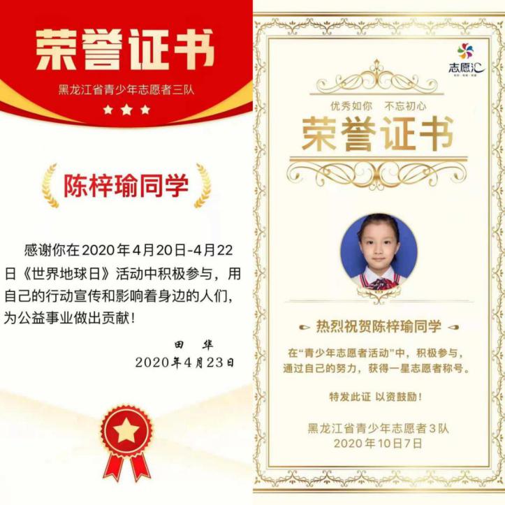 陳梓瑜同學熱衷于志愿服務活動。連續三期參與了為貧困小學捐書志愿活動、“美化井蓋·建文明城市”系列志愿服務、積極參與“雛雁計劃助學活動”,她積極組織策劃了 “小小圖書管理員·你我共建”志愿活動、“垃圾分類小衛士”志愿活動、幫助哈爾濱市公安局推廣“防詐騙軟件志愿活動”。