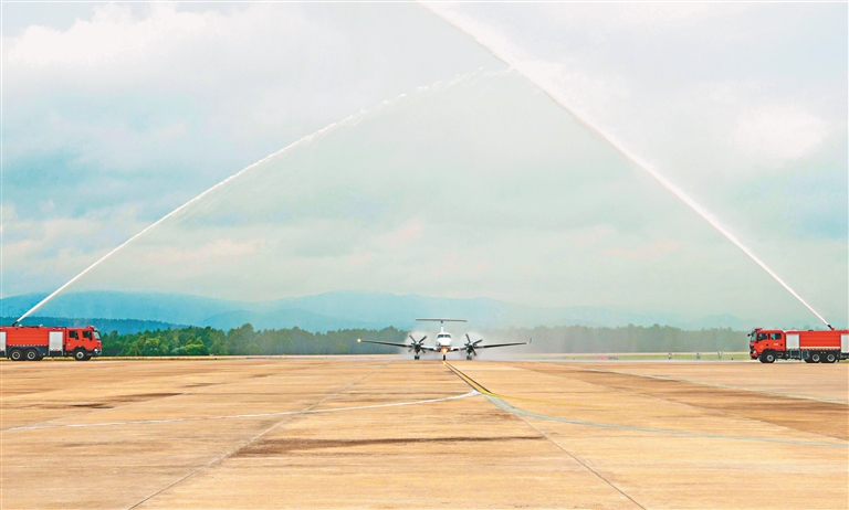 伴隨著飛機(jī)的轟鳴聲,命名為“林都號(hào)”的國(guó)王350飛機(jī)平穩(wěn)降落林都伊春,緩緩駛向林都機(jī)場(chǎng)5號(hào)停機(jī)坪。當(dāng)飛機(jī)落地脫離跑道后,左右兩側(cè)的消防車開(kāi)始噴射水霧,兩束水霧相互交錯(cuò),以“水門禮”熱烈歡迎乘坐“林都號(hào)”來(lái)伊春的游客。