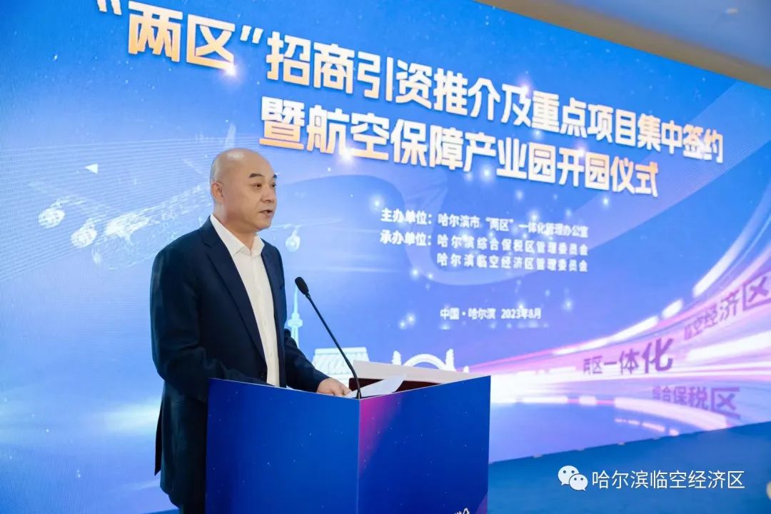 欒志成在致辭中表示,哈爾濱綜合保稅區搶抓對外貿易創新試點和跨境電商綜合實驗區戰略機遇,打造“保稅+特色”產業體系,成為龍江開放新高地、對外合作新載體;哈爾濱臨空經濟區區位優勢獨特明顯,向北開放、蓄勢騰飛,是名副其實的冰城之門、龍江之窗。“兩區”實行一體化管理,兩翼齊飛、協同發展、同頻共振,疊加優勢成勝勢,必將成為哈爾濱市經濟發展新的增長極,對建設開放龍江、打造向北開放之都具有重大現實意義和深遠歷史意義。