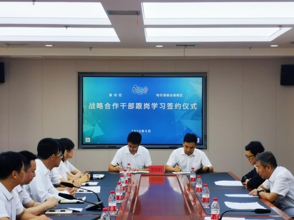 黑龍江經濟網訊(記者商祺)9月8日上午,哈爾濱綜合保稅區管委會與香坊區委組織部舉行戰略合作協議簽約儀式暨干部跟崗學習對接會。哈爾濱綜保區管委會常務副主任、黨工委副書記邸凱與香坊區委組織部部長楊鐵巖出席會議并代表雙方簽約。相關單位主要領導及10余名跟崗學習干部參加會議。