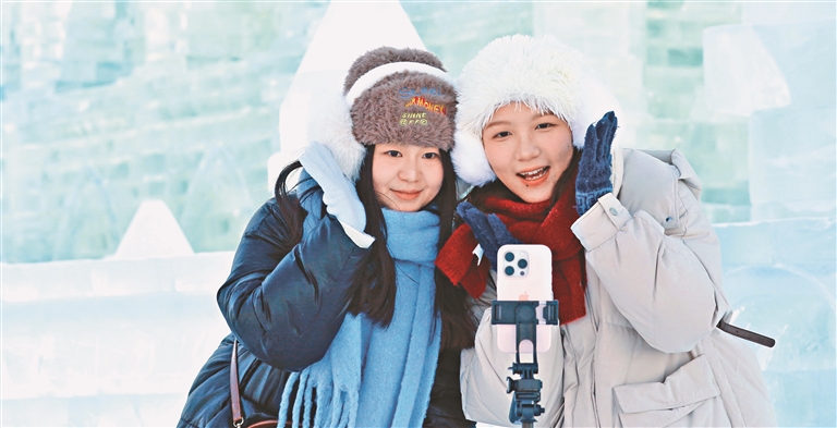 冰雪大世界游人如織,每處冰景前都有拍照留念的游客。 本報記者 蔣國紅 張澍攝