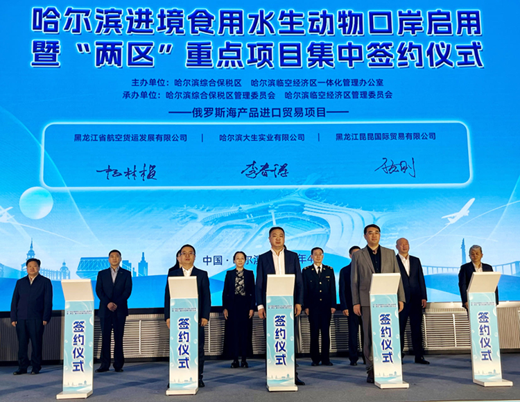 同日,哈爾濱進境食用水生動物口岸啟用暨“兩區”重點項目集中簽約儀式在哈爾濱臨空經濟區舉行。“兩區”一體化辦公室主任介紹了哈爾濱進境食用水生動物指定監管場地和保稅航油項目基本情況。