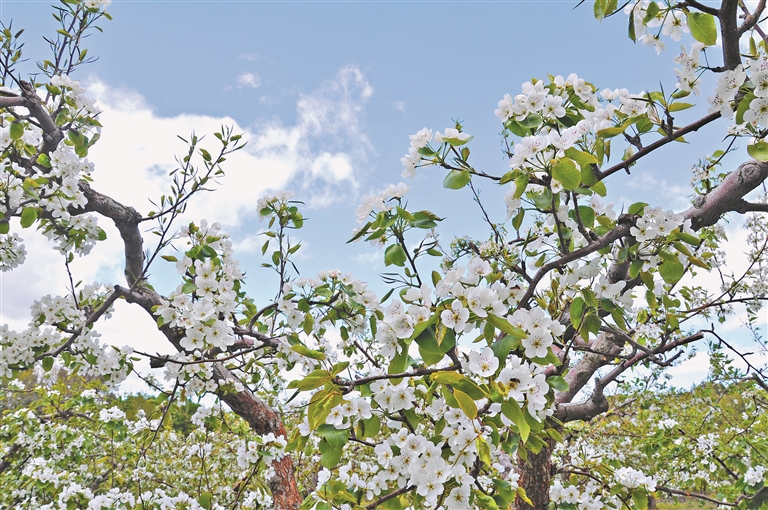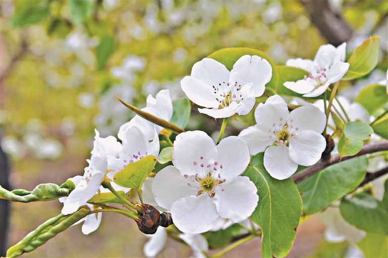 一場小雨過后,花瓣上、樹葉上一滴滴晶瑩剔透的水珠給梨樹增添了幾分韻味,梨花帶雨,讓人又憐又喜。漫步梨園,樹上朵朵梨花如雪,地面蒲公英花金黃,頭頂是湛藍的天空和朵朵白云,一只只繁忙的小蜜蜂在花間“起舞”。漫步其中,仿佛游走于一幅畫卷中,讓人只想留住這美麗的瞬間。