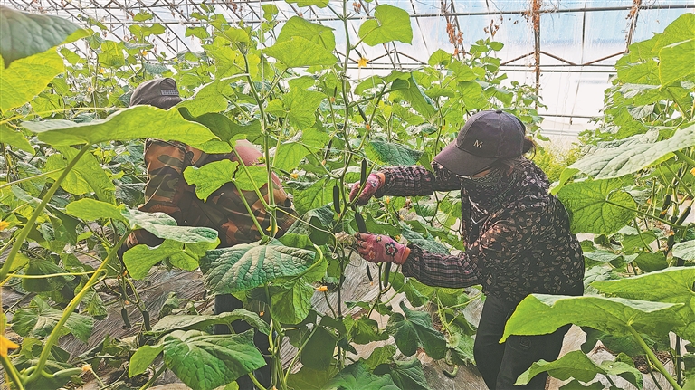 工作人員正在大棚里采收水果黃瓜。本報記者 李健攝