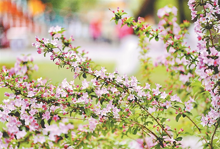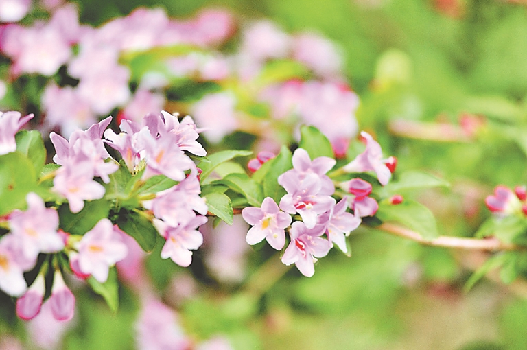 5月22日,哈爾濱市兆麟公園綠地里種植的多棵錦帶花迎風綻放,為夏日冰城增添了更多的色彩,許多游人駐足觀看。