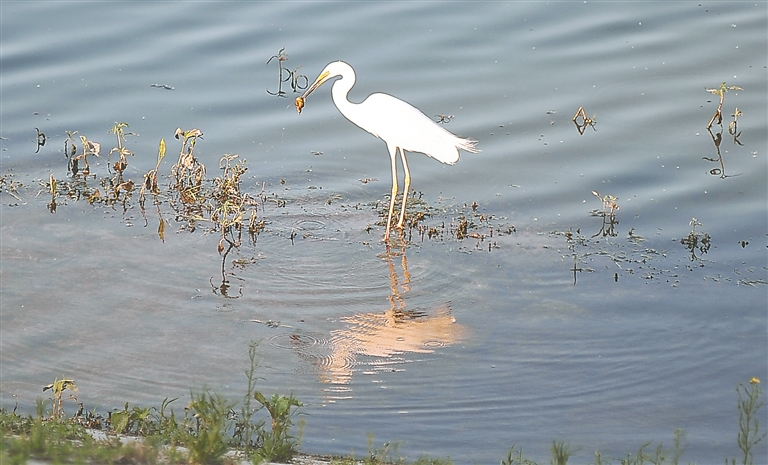 近日,哈爾濱市道里區友誼西路附近的何家溝畔,一只白鷺多次飛到這里休憩、捕魚。