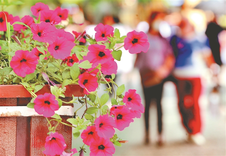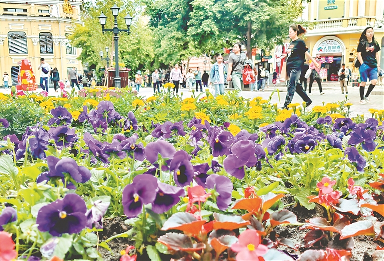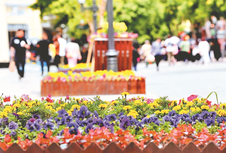 13日,哈爾濱市道里區中央大街上,行人從五彩繽紛的花卉旁走過。進入夏季,來哈爾濱避暑游玩的游客不斷增多,為給游客打造一個舒適美麗的旅游環境,中央大街上種植了三色堇、金魚草、矮牽牛、四季海棠等多種花卉。這些鮮花姹紫嫣紅、爭奇斗艷,將整條街道裝點得十分靚麗。