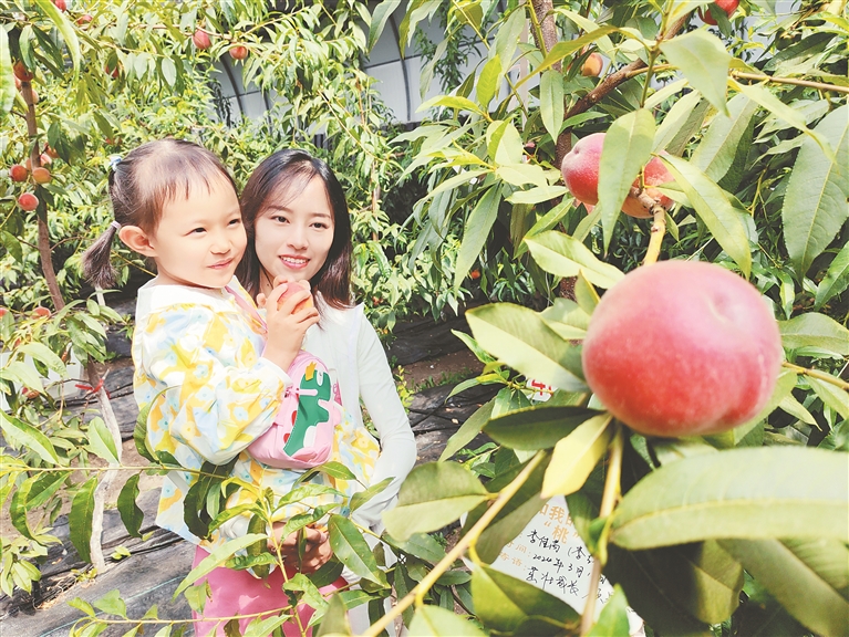 “我認養(yǎng)了一棵桃樹,今天和妻子共同看看桃子的長勢,過些天就可以親自采摘了。”關(guān)勇和妻子正在查看認養(yǎng)的桃樹。