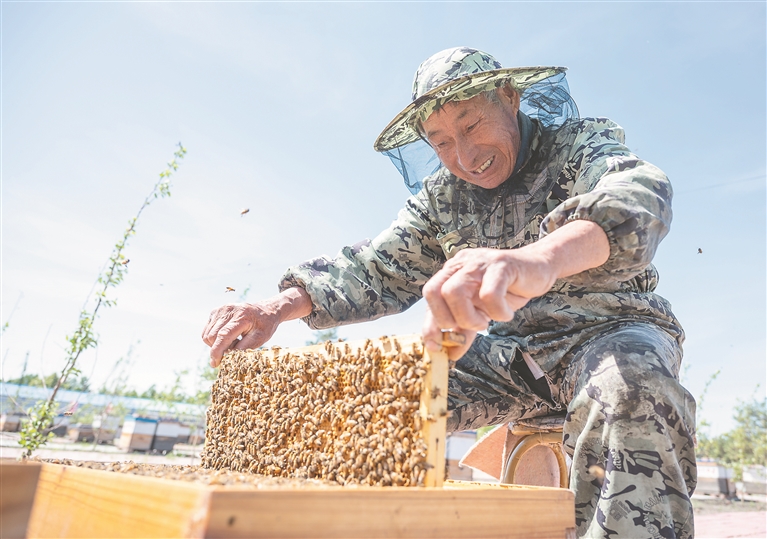 盛夏,草木蔥蘢、百花盛開,正是蜜蜂采蜜的好時節。走進齊齊哈爾市克東縣東興林場,上百箱規格統一的木質蜂箱整齊排列,蜂箱周圍,勤勞的蜜蜂們正忙碌地搬運著甜蜜果實,發出嗡嗡的聲響。