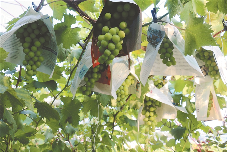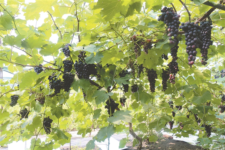 “‘陽光玫瑰’是近幾年引進的新品種,因其果肉多、甜度高、口感佳,受到不少市民的喜歡,每年都有不少商家、居民前來采購。目前,‘夏黑’已處于成熟期,‘陽光玫瑰’預計9月中下旬成熟。”曹偉勝介紹。