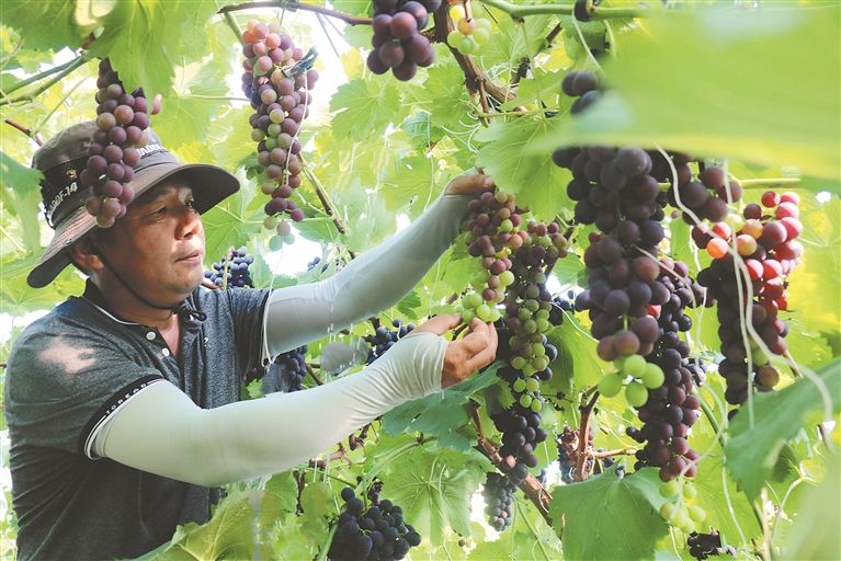 “春棚栽培的葡萄在8月中旬成熟,而在暖棚里,由于溫度、濕度得到科學精準控制,葡萄成熟得更早,產量更高。7月10日左右即可上市,搶占市場空缺。”蔬菜公司負責人王軍強邊說一邊拿起手機拍攝,為一周后葡萄上市進行宣傳。