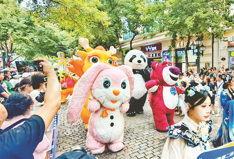 14日下午,哈爾濱市道里區中央大街上舉行了巡游活動,吸引游客們駐足觀看、拍照。