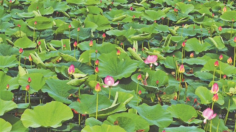 接天蓮葉無窮碧,映日荷花別樣紅。盛夏時節,哈爾濱大劇院濕地里的荷花或含苞待放,或含羞盛開。粉色、白色的花瓣在荷葉間亭亭玉立隨風搖擺。