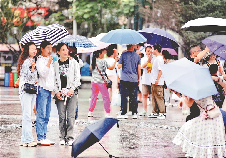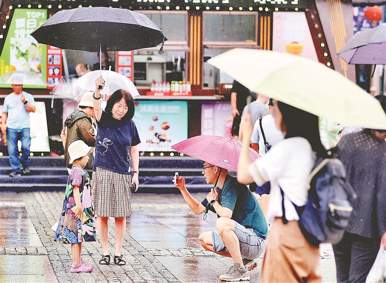 23日,哈爾濱市出現陣雨天氣。在索菲亞教堂、中央大街、江畔等地,游客們一邊觀賞美麗風景,一邊享受夏日清涼。