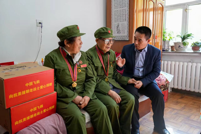 飛鶴乳業黨委書記朱天龍(右)帶領工作人員看望抗美援朝老戰士