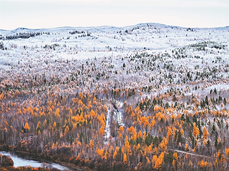從空中俯瞰最北邊城儼然已經進入冬季。眼下正值漠河的金秋時節,突如其來的降雪為北國秋色增添了別樣美景。松枝上布滿了厚厚的雪球,山林之間的秋色景觀與皚皚白雪同框,火車在白雪森林間穿行而過,令南方游客驚嘆不已。本報記者 張磊攝