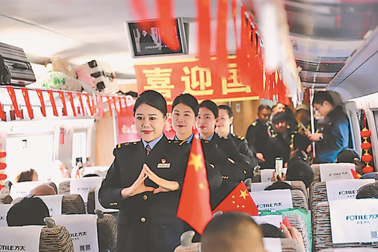 G774次列車乘務人員與乘客一起聯歡。本報記者 王迪攝