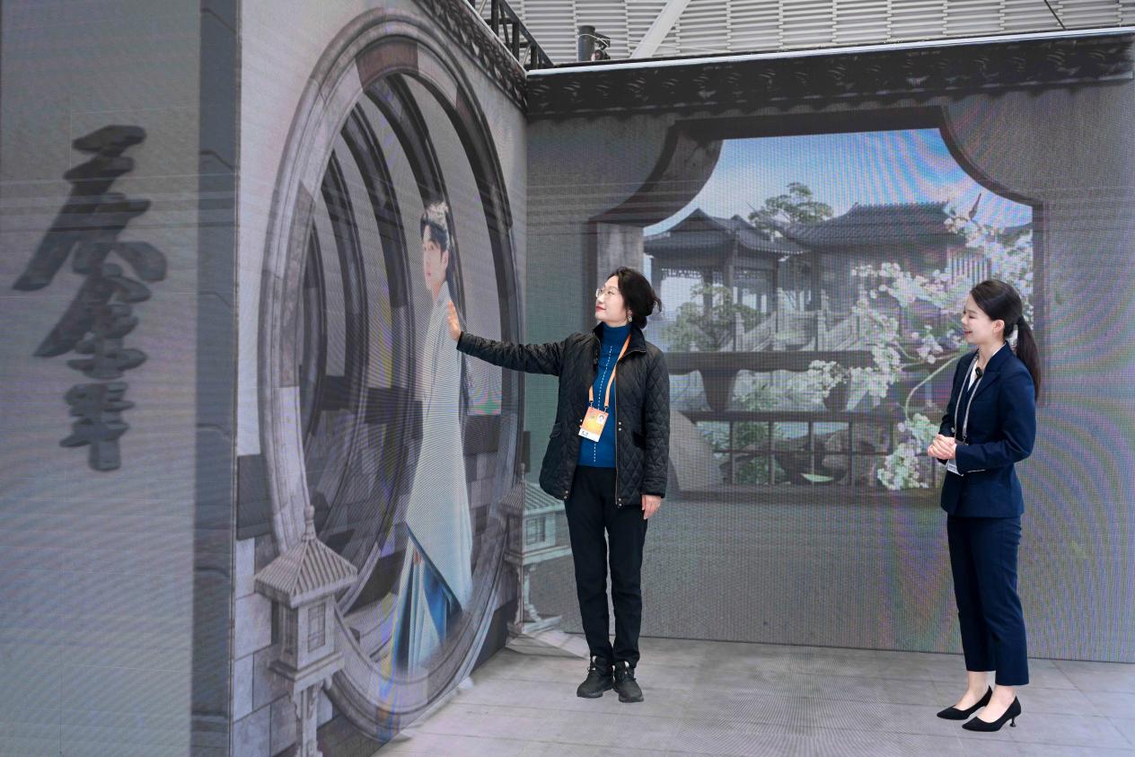 文化板塊,是騰訊本次展會的一大亮點。在“騰訊文化IP盒子”中,集合騰訊文學、影視、音樂、游戲、電競、動漫六大板塊的文化產業集群躍然眼前。在以裸眼3D模式呈現的三面屏中,觀眾可以一覽騰訊文化產業的全球布局,走入《慶余年》《繁花》等IP經典場景中進行合影,并通過現場設置的AI智能體,與劇中的虛擬角色實時語音互動。