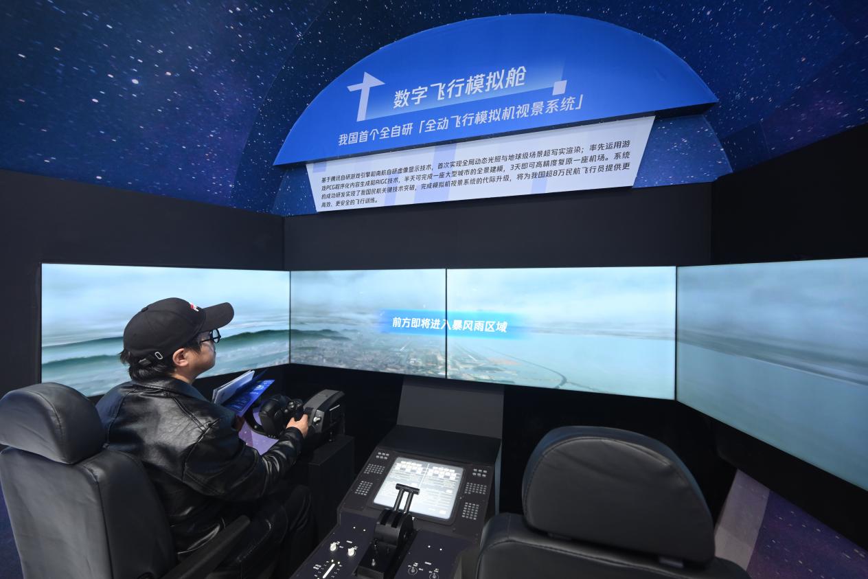 “只需要推動操縱桿,就能操作系統,體驗民航飛行員第一視角下、擬真的訓練場景……”在展區前方,由南航自研虛像顯示技術和騰訊自研游戲引擎技術共同打造的全動飛行模擬機視景系統,吸引眾多參觀者體驗。基于騰訊自研游戲引擎,系統首次實現全局動態光照與地球級場景超寫實渲染,多邊形生成面數較之前提升380倍、貼圖精細度提升100倍,助力實現我國民航關鍵技術突破。