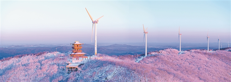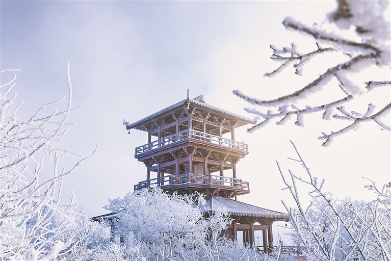 山林間云霧彌漫,白雪和蒼勁的虬枝映襯,山頂的天佑閣和一個個白色巨人般的發電“風車”相映成趣,將這座名山裝扮得更加素雅、更顯活力。近處,松柏全都凝霜掛雪,戴銀披玉。山頂原始次森林中,低矮的灌木叢也被積雪覆蓋,成為了一朵朵五彩的冰花。高大的樹木被輕盈的雪花點綴,晶瑩剔透,仿若玉樹瓊枝,隨風搖擺,宛如仙境。