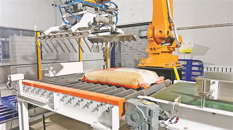 楊旭升介紹:“我們基地今年新增加全自動封袋機、全自動機械手臂,實現全自動封袋包裝、碼垛功能,也可實現24小時不間斷加工作業,提高種子加工速度的同時,大大節省勞動力,節省空間,提高生產效率。”
