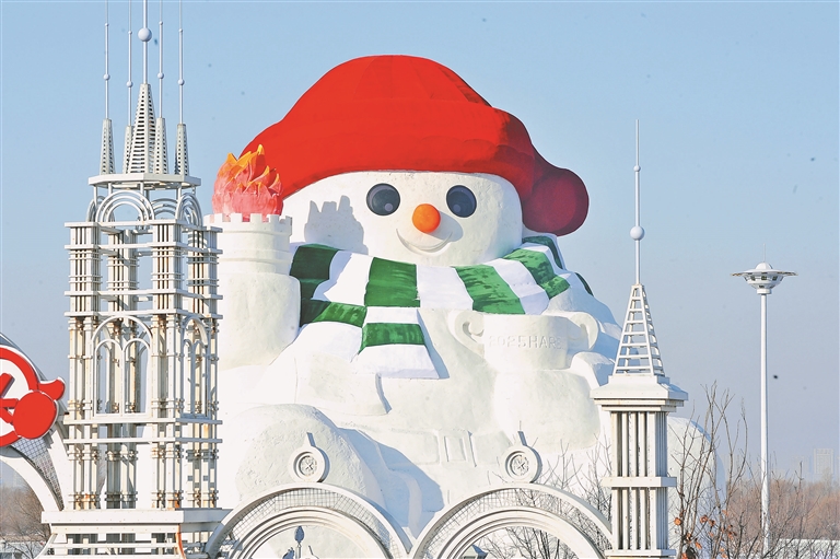 近日,哈爾濱市道里區群力江畔雪人碼頭,23米高的大雪人主體已經完成,工人正在進行收尾工作。這座大雪人頭戴紅帽子,圍著白綠相間的圍脖,手里舉著火炬,十分可愛,吸引了許多游客和市民前來觀看。