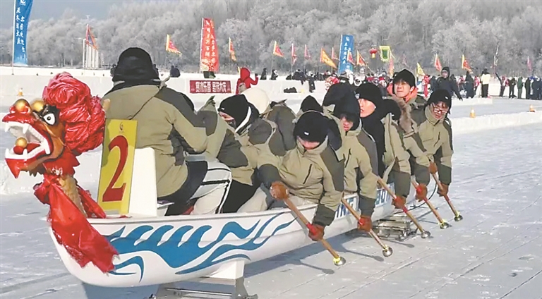 伴隨著動感的音樂聲和歡呼聲,冰面之上百釬齊發,龍舟疾馳。隊員們劃槳動作整齊劃一,鑼鼓聲、吶喊聲形成了一曲激昂的冬日交響樂。當冠軍隊伍沖線的一刻,現場爆發出更熱烈的歡呼聲,豪邁的氣勢與聲浪響徹萬寶湖上空。