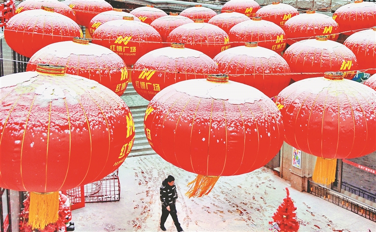 7日,臘八節,哈爾濱市迎來降雪天氣。在白雪映襯下,街邊和廣場上懸掛的大紅燈籠更顯喜慶。街上的行人紛紛拿出手機拍下精彩瞬間。在一些市場內,銷售臘八粥、臘八蒜的攤位擠滿了消費者,生意十分紅火。