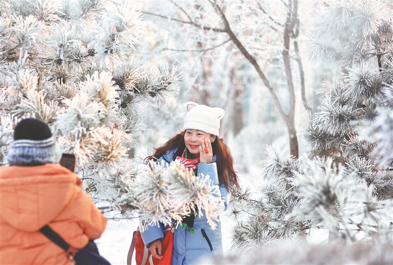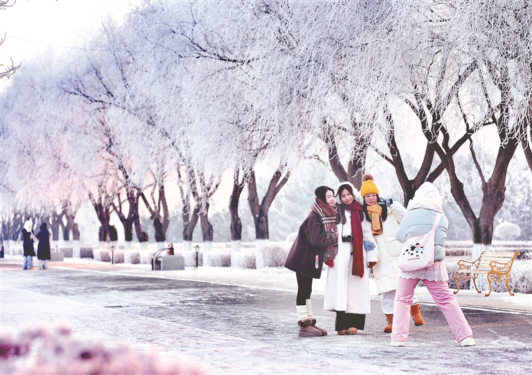 在松花江畔,一排排樹木都變成了白色,枝頭的冰晶反射著太陽(yáng)的光芒,景色迷人,走入其中,仿佛置身于童話世界。游客們一邊觀賞霧凇美景,一邊用手機(jī)拍下精彩瞬間。