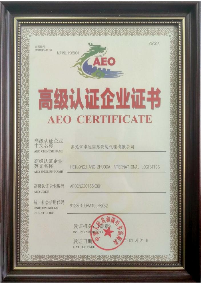 圖1黑龍江卓達國際貨運代理有限公司AEO認證證書