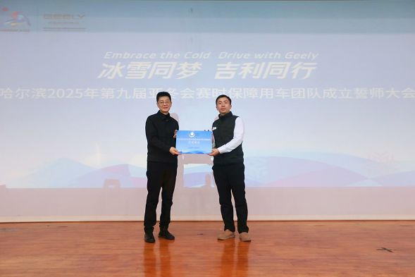 在莊重而熱烈的氛圍中,現場隆重舉行了乘用車保障團隊授旗儀式。駕駛員們整齊列隊,許下了鄭重的承諾:“精準調度,安全駕駛,嚴格守時,真情服務。高效整備,細致維護,保障有力,穩健運行。全力實現:零投訴、零延誤、零事故。用真情護航,用智慧開道,冰雪同夢,吉利同行。”