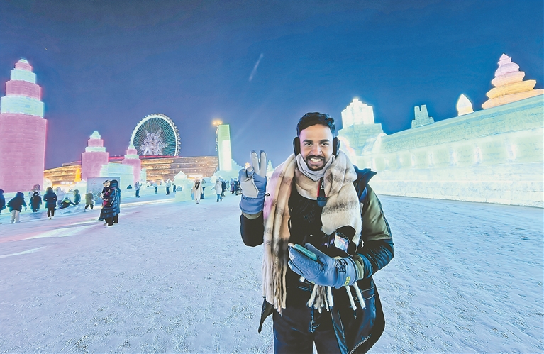 夜幕降臨,園區里五彩斑斕。徜徉其中,記者不時與遠道而來的國際友人擦肩而過。印度游客庫洲倫一路走走停停,仿佛一位尋寶者,在冰雪編織的夢幻王國中盡情探索。他胸前挎著一臺單反相機,手中握著手機,眼中閃爍著滿滿的驚奇。每一次駐足,每一次與冰雕雪塑的凝視,都伴隨著按下相機快門的聲響。